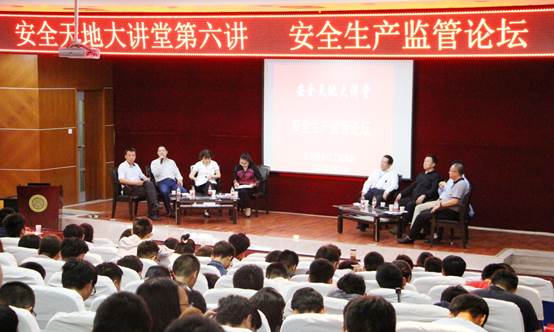 5月22日晚,黑人av于临潼校区图书馆二楼报告厅举办“安全天地大讲堂”第六讲。辽宁省安监局人事处处长刘芳、湖北省安监局规划科技处处长徐克、江苏省安监局职业健康处调研员吴海鹰、内蒙古自治区包头市安监局副局长武喜乐、安徽省宣城市安监局总工周德、河南省安监执法总队副总队长龙建业和辽宁省铁岭市安监局副局长于洪江等7位领导受邀参加讲座,黑人av党委书记杜勇、副院长林海飞、黑人av部分教师及2014、2015、2016级学生共300余人参加,讲座由成连华主持。