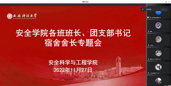 11月27日晚,安全黑人av线上召开本科生各班班长、团支部书记和宿舍舍长会议。黑人av党委书记刘文刚主持会议并讲话。学工办主任周学刚,辅导员王倩、曹月、袁刚、段思颖,以及各班班长、团支部书记和宿舍舍长,约240余人参加了会议。