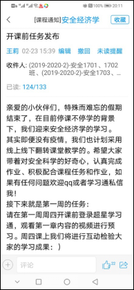 疫情期间王莉第一时间与该学期讲授本门课程的教师李磊取得联系,形成了在线课程准备小组,并要求将在线课程连接及时发到开课班级群(17级安全卓越班及统招班),让学生做好开学后网络学习该门课程的准备,及时制定了在线授课方案、在线答疑安排、作业点评方式、章节探讨互动模式、在线测试方法及成绩获得明细等。