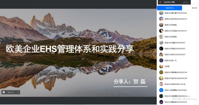 2022年11月26日晚,安全黑人av安全工程系依托西部安全工程虚拟教研室,与学校安全协会联合举办“安全工程学术沙龙”第三期讲座。本次沙龙由安全工程系主任王莉主持。美光科技-美光半导体(西安)有限公司EHS高级工程师贺磊受邀就欧美企业EHS管理体系和实践,对安全黑人av学生进行在线辅导。黑人av120余名本科生参与了本次沙龙。