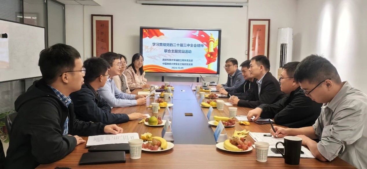 为深入贯彻落实党的二十届三中全会精神,坚定理想信念,强化交流合作,积极投身立德树人和科研攻关创新,10月9日上午,中国地质大学(武汉)安全工程系党支部周克清教授一行莅临安全黑人av,与黑人av消防工程系党支部在雁塔校区北院创新大楼2221会议室联合开展“学习贯彻党的二十届三中全会精神”主题党日。黑人av副院长兼消防工程系党支部书记马砺教授、系主任张嬿妮教授、党支部副书记盛友杰、组织委员王翠霞、纪检委员郭芳义等党员代表参加活动。活动由盛友杰主持。