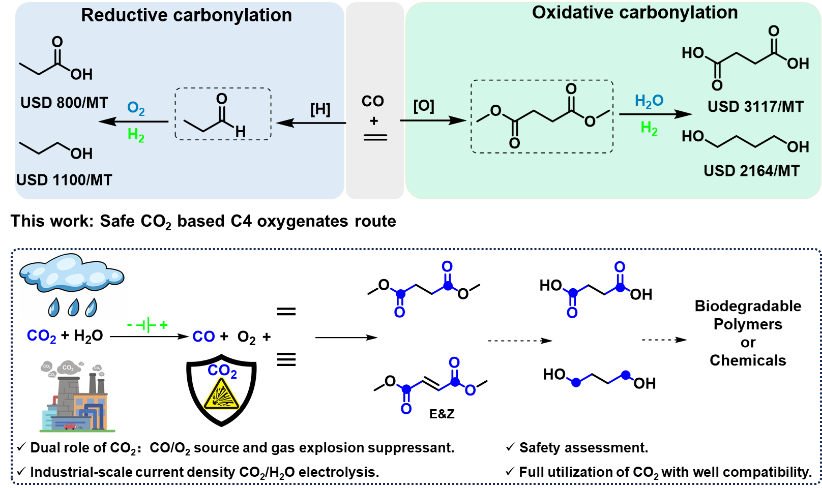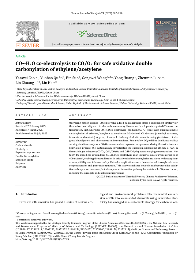 近日,黑人av 罗振敏教授团队联合中国科黑人av兰州化学物理研究所、武汉大学在化学领域顶级期刊《Chinese Journal of Catalysis》(中国科黑人av一区TOP期刊,影响因子17.7)上发表合作研究论文《CO2-H2O co-electrolysis to CO/O2 for safe oxidative double carbonylation of ethylene/acetylene》。该研究创新性地将CO2还原与羰基化反应耦合,为CO2的高值化利用提供了兼具高效与本质安全的新策略。该工作体现了安全科学与工程学科、化学工程学科的深度交叉融合。苏彬副教授为共同第一作者,罗振敏教授为论文共同通讯作者。