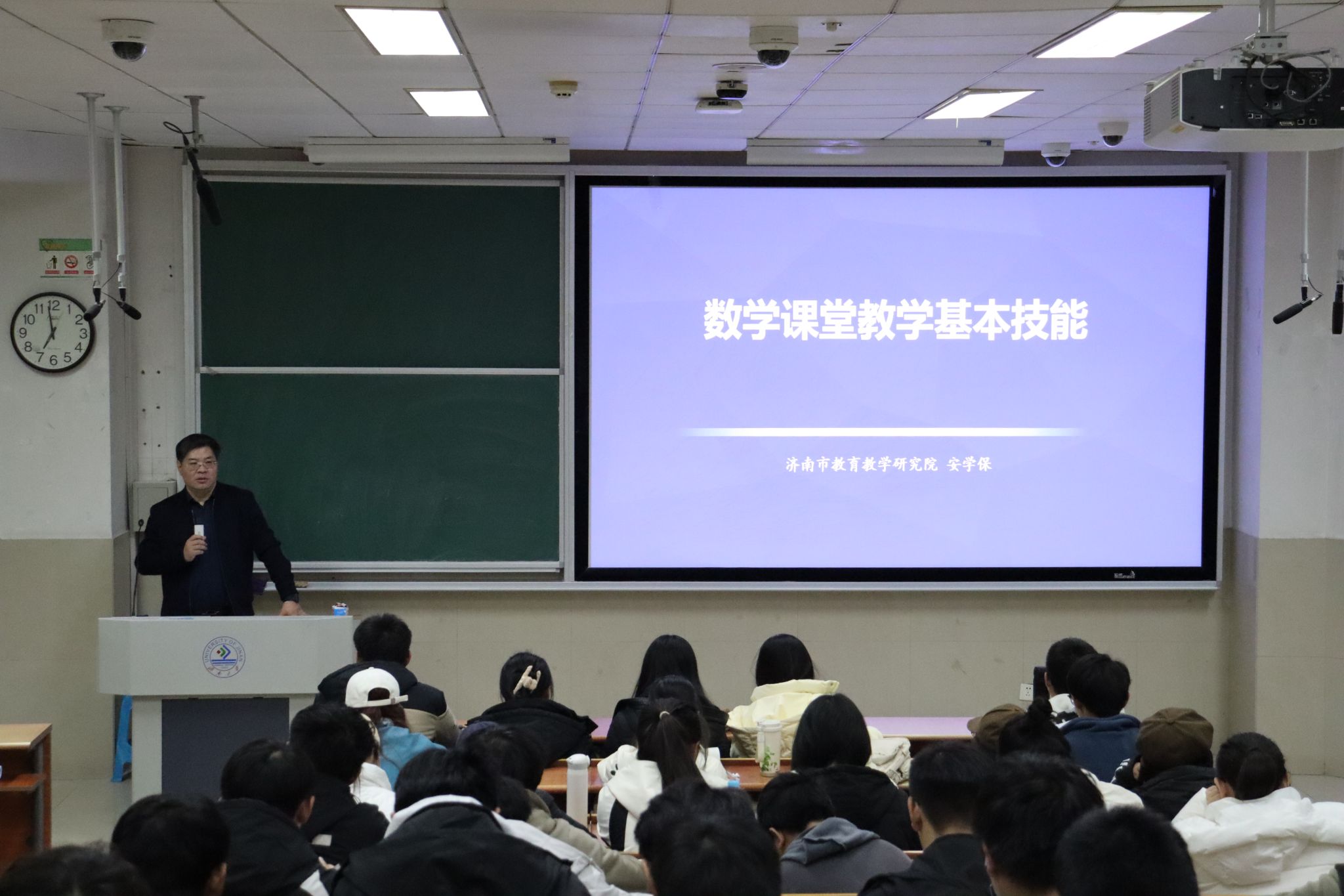 特邀济南市教育科学研究院高中数学教研员安学保老师作“数学课堂教学基本技能”的主题报告,学院数学与应用数学专业学生参加活动,数学与应用数学系主任陈文娟教授主持报告会。