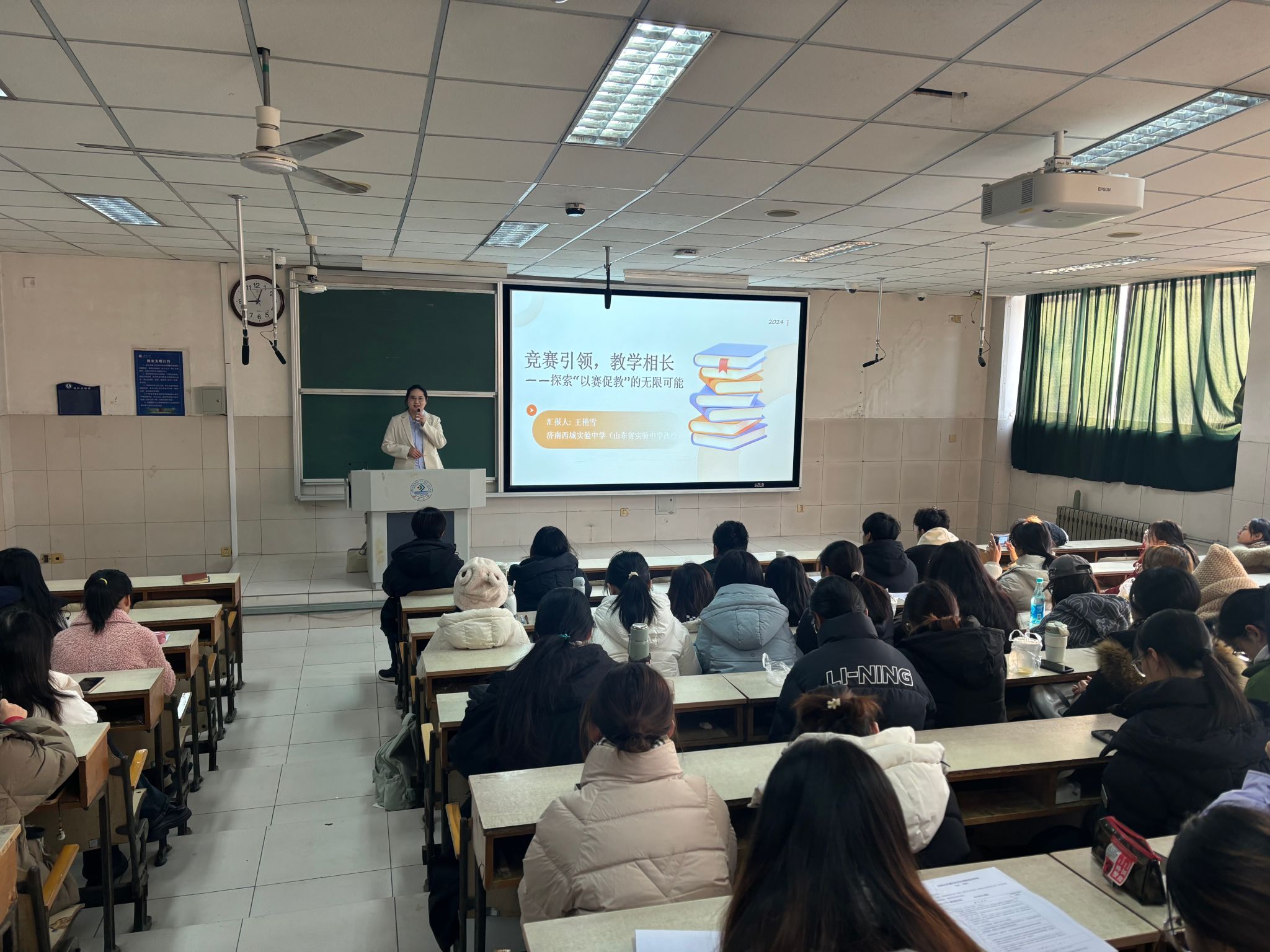王艳雪以《竞赛引领,教学相长--探索“以赛促教”的无限可能》为题做分享,分别从山东省教师技能大赛、教师编制考试、教师成长之路、大学生实习准备等方面分享自己的经验。
