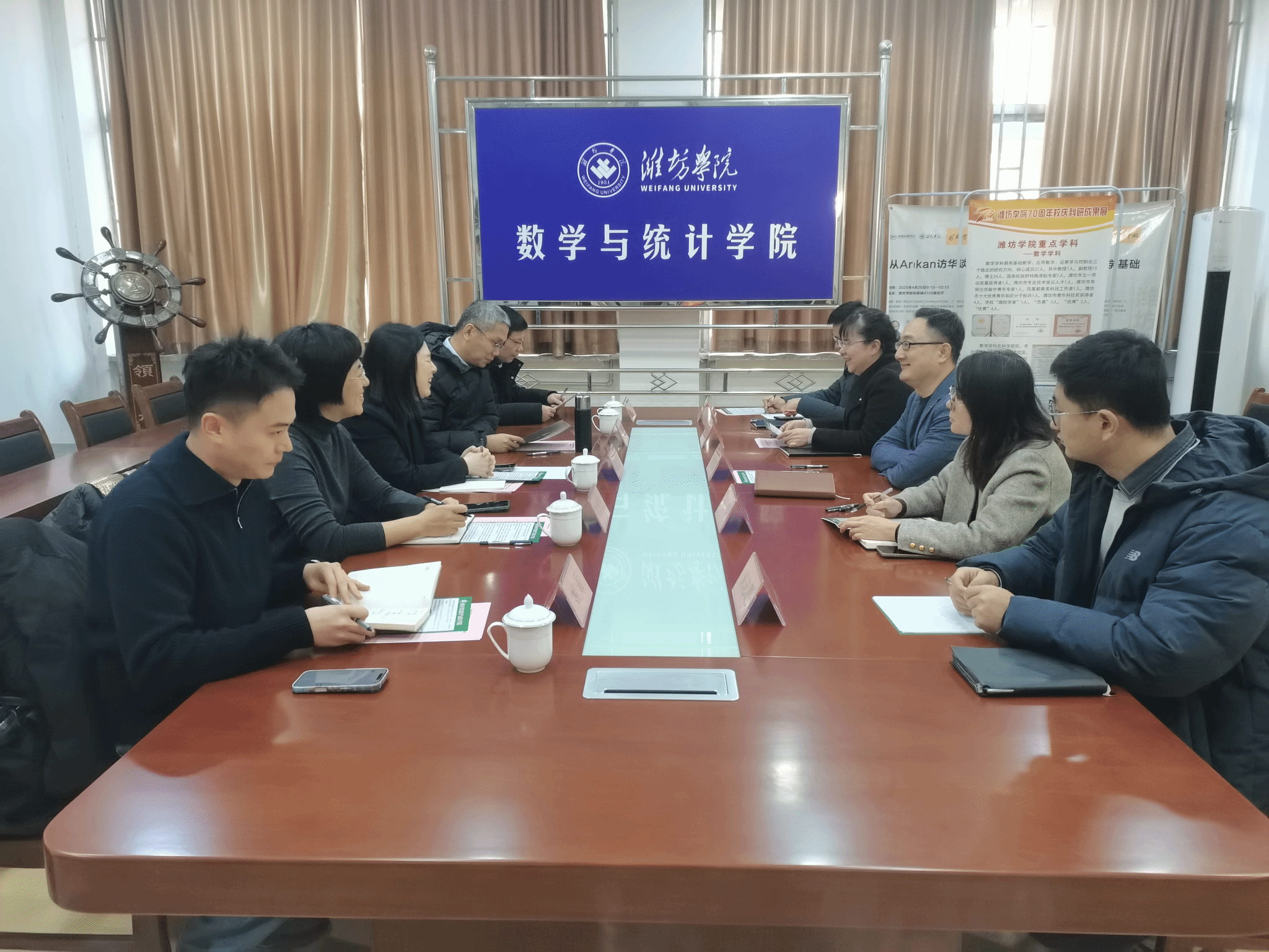 1月27日上午,学院党委书记崔英静,院长孙元功,党委副书记、副院长张沂红,副院长王洪凯,团委书记姬磊到潍坊学院数学与统计学院开展交流学习。