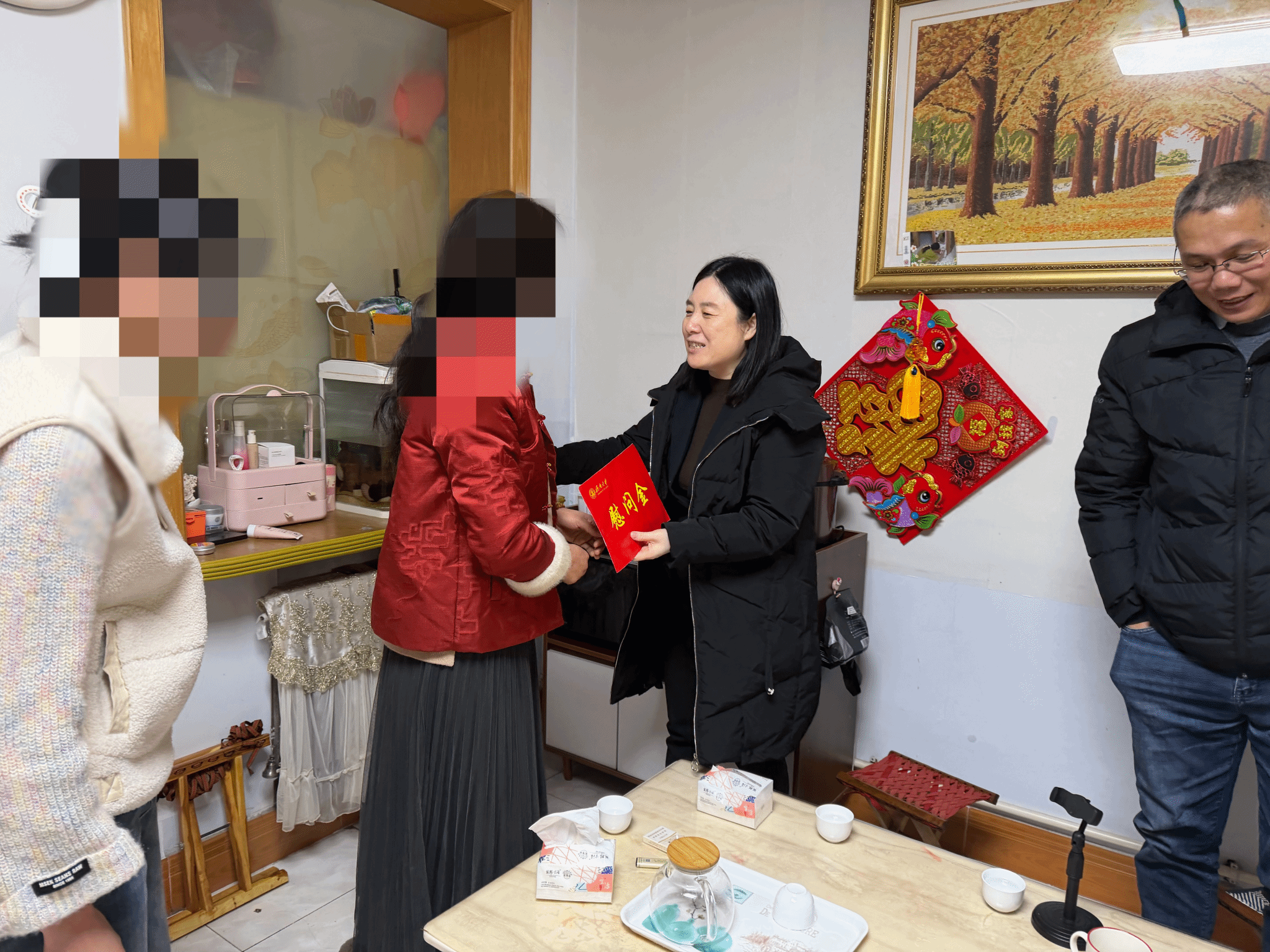 家访团队一进门便送上精心准备的慰问金、慰问礼品及新春祝福,与学生及其父母促膝长谈。崔英静详细询问了学生母亲的病情恢复情况、家庭经济来源等基本情况,对家庭面临的赡养压力和生活困难深表关切。向家长详细介绍了国家和学校的奖助勤贷政策,明确表示学院将持续为其提供必要帮扶,解除学生求学的后顾之忧。