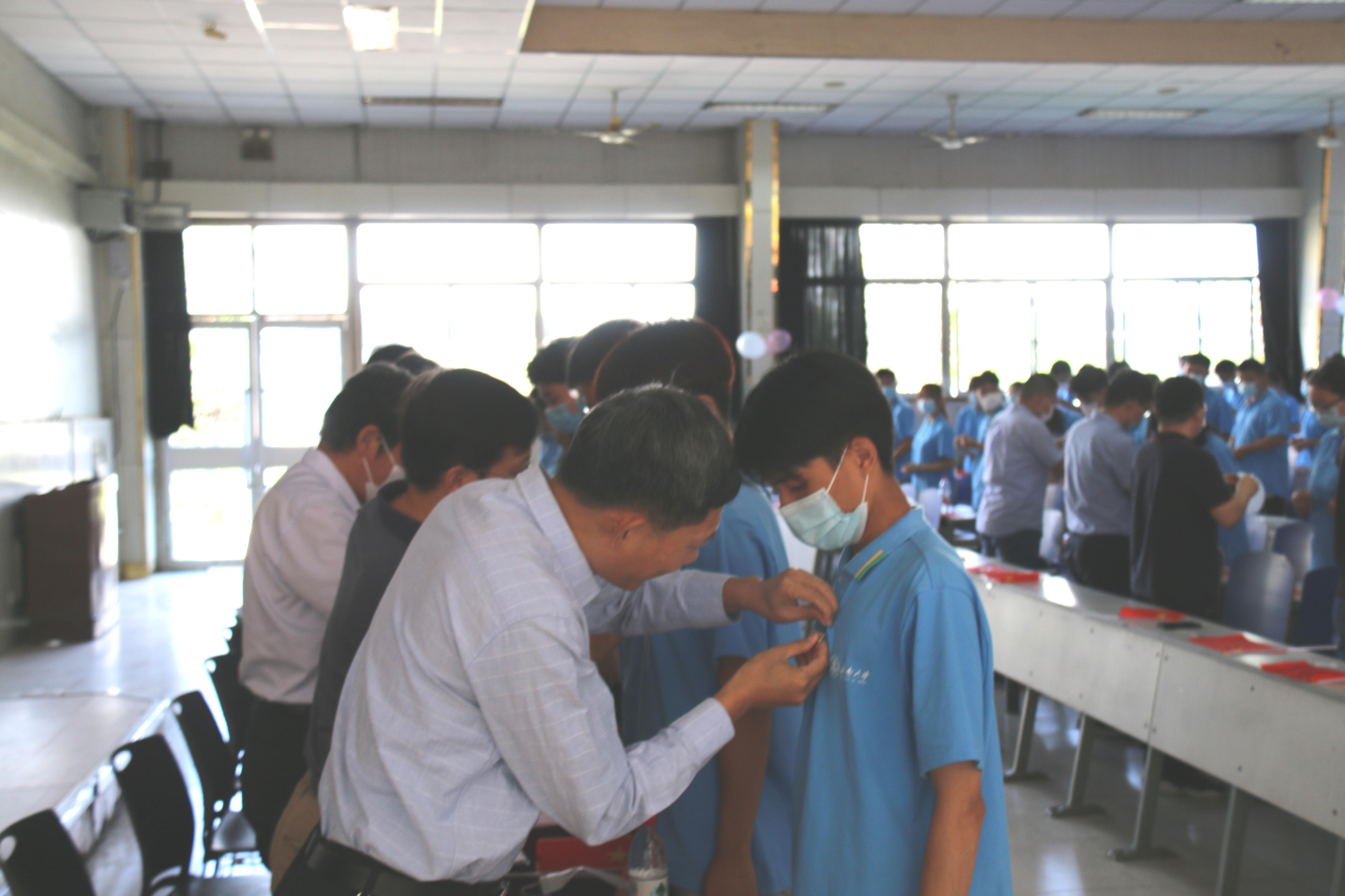 典礼在隆重的奏唱国歌中拉开序幕。学院院长管延勇致辞,毕业生代表、新生代表先后发言;学院党委书记侯启海发表讲话;各系部主任、班主任辅导员为新生佩戴校徽。