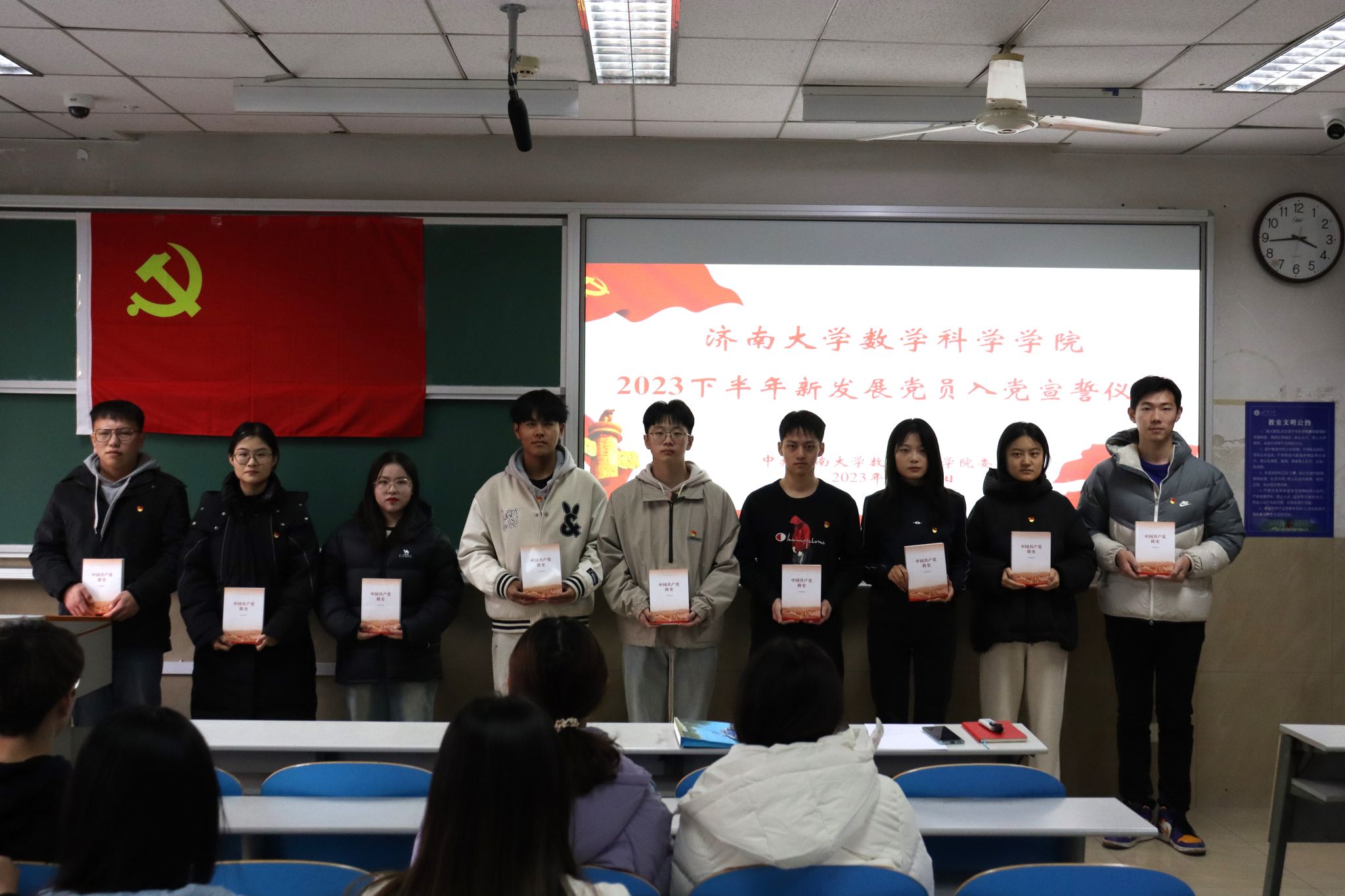 宣誓仪式以奏唱《国际歌》开始,在场人员在金融数学学生党支部副书记鲁明慧的带领下,起身肃立,握拳过肩,目光坚定,面向鲜红的党旗,庄严宣誓。宣誓后,学院党委向每名新发展党员发放《中国共产党简史》,勉励大家进一步加强理论学习,厚实理论功底。
