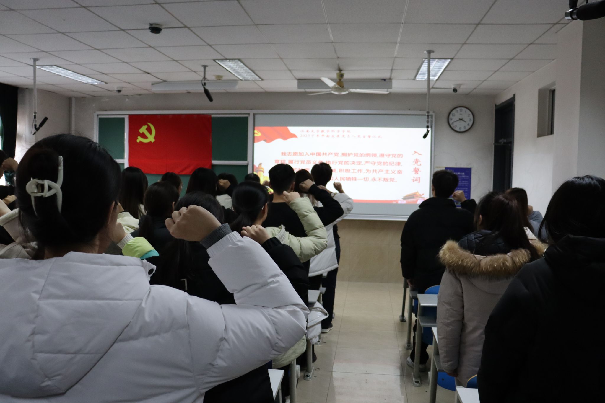 为深入学习贯彻习近平新时代中国特色社会主义思想,强化新发展党员党性修养,增强党组织的凝聚力、战斗力和影响力,近日,学院党委组织2023年下半年新发展党员进行入党宣誓。学院党委副书记张沂红出席仪式并讲话,学院全体学生党支部书记、副书记,以及2023年下半年新发展党员参加宣誓仪式。