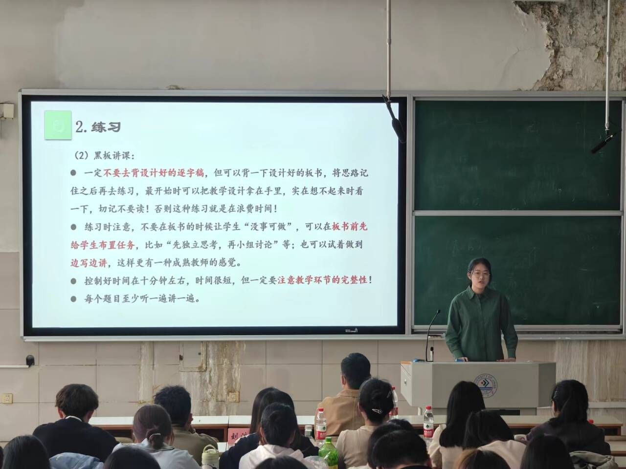 会议开始,崔骁菀从如何备课、如何讲课以及参赛心得三个方面分享了自己的经验,对PPT的制作思路、主题颜色以及黑板讲课的板书设计、内容安排等细节进行了详细的讲解。此外,崔骁菀还表示可以在优秀教师讲课比赛视频中观察学习她们的神态、动作、停顿以及语调变化。刘浩然则是从大赛流程概述,如何找准定位,怎样安排练习,个人经验四个部分进行了分享,对讲课内容的思政元素、课程设计的重点、讲课过程的互动等等作出强调,并现场给同学们展示了大赛中的黑板讲课环节,让同学们对师范生技能大赛有了更加深刻的认识和了解。