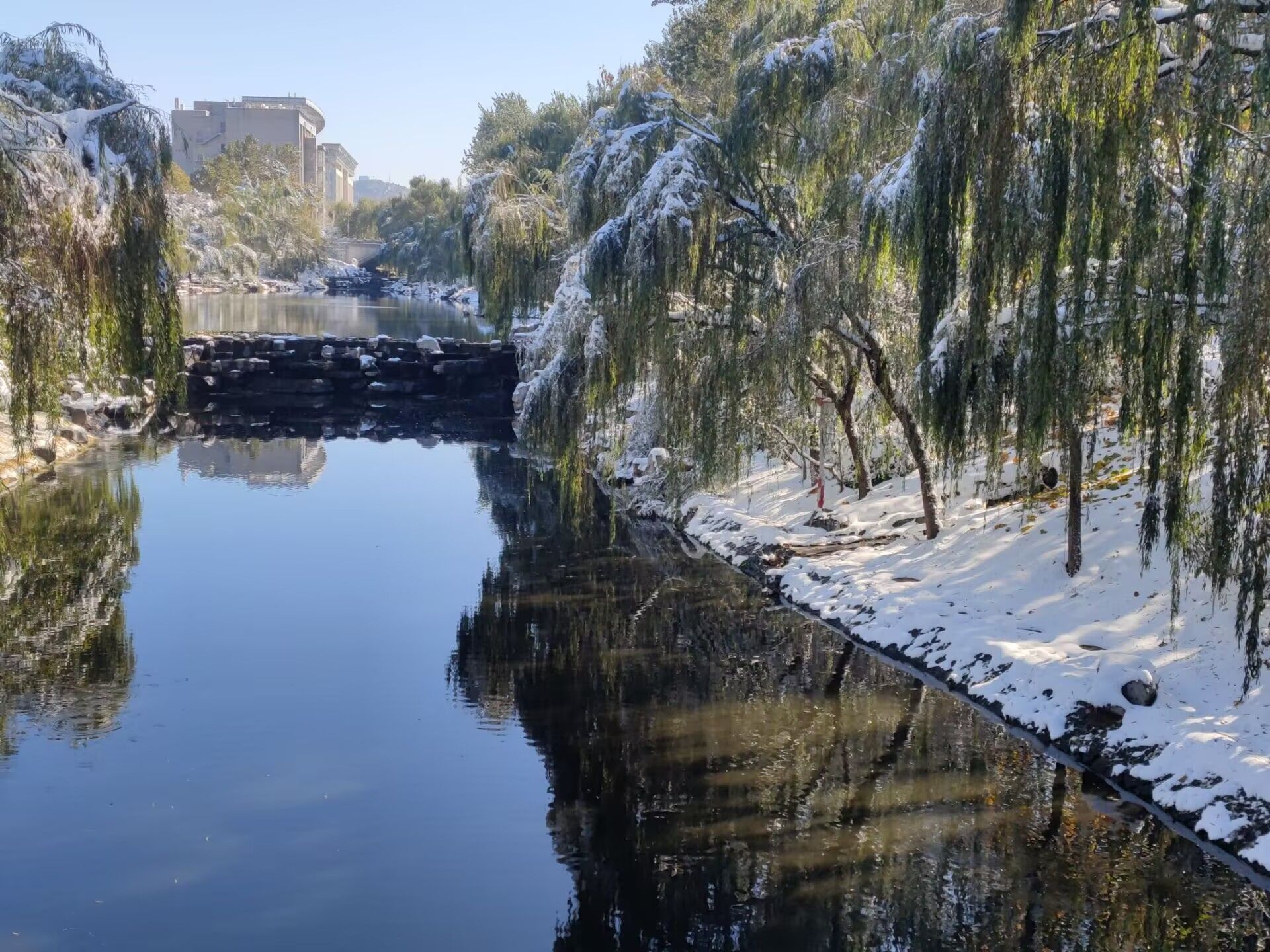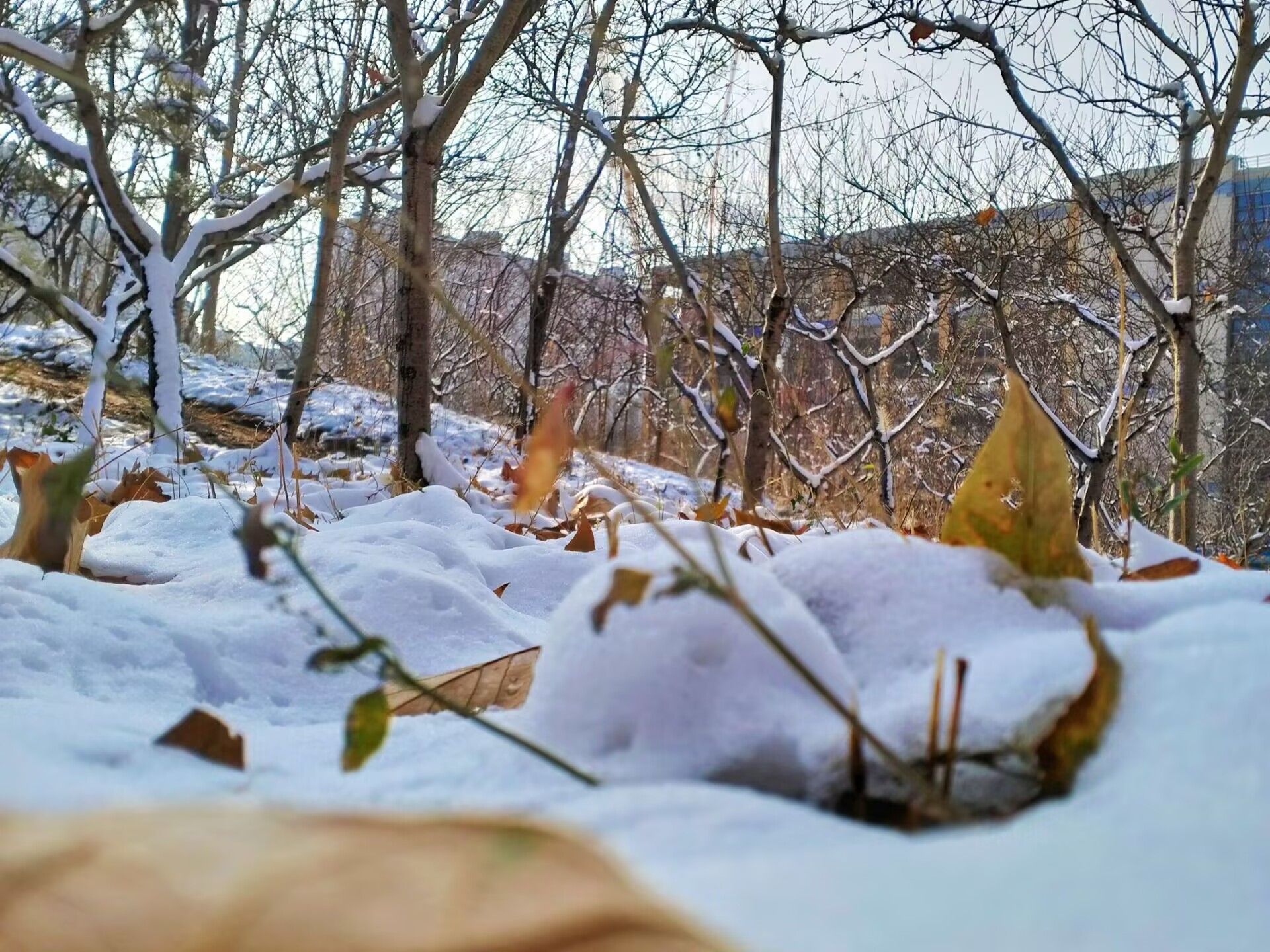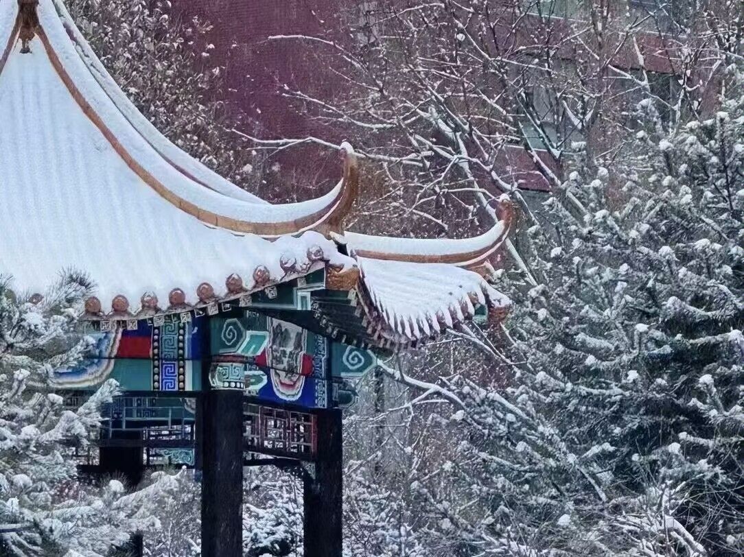 初雪飘临,教学楼静静矗立。飞絮洒落屋顶、窗台,似为其披上素白披风,冷峻轮廓在雪雾里渐趋柔和,二者相映,构成一幅校园冬景图。