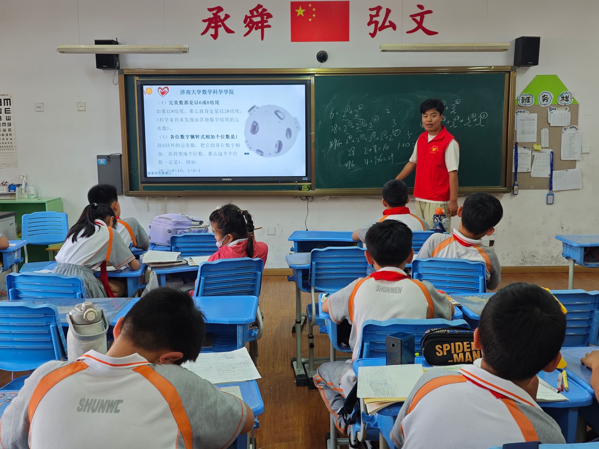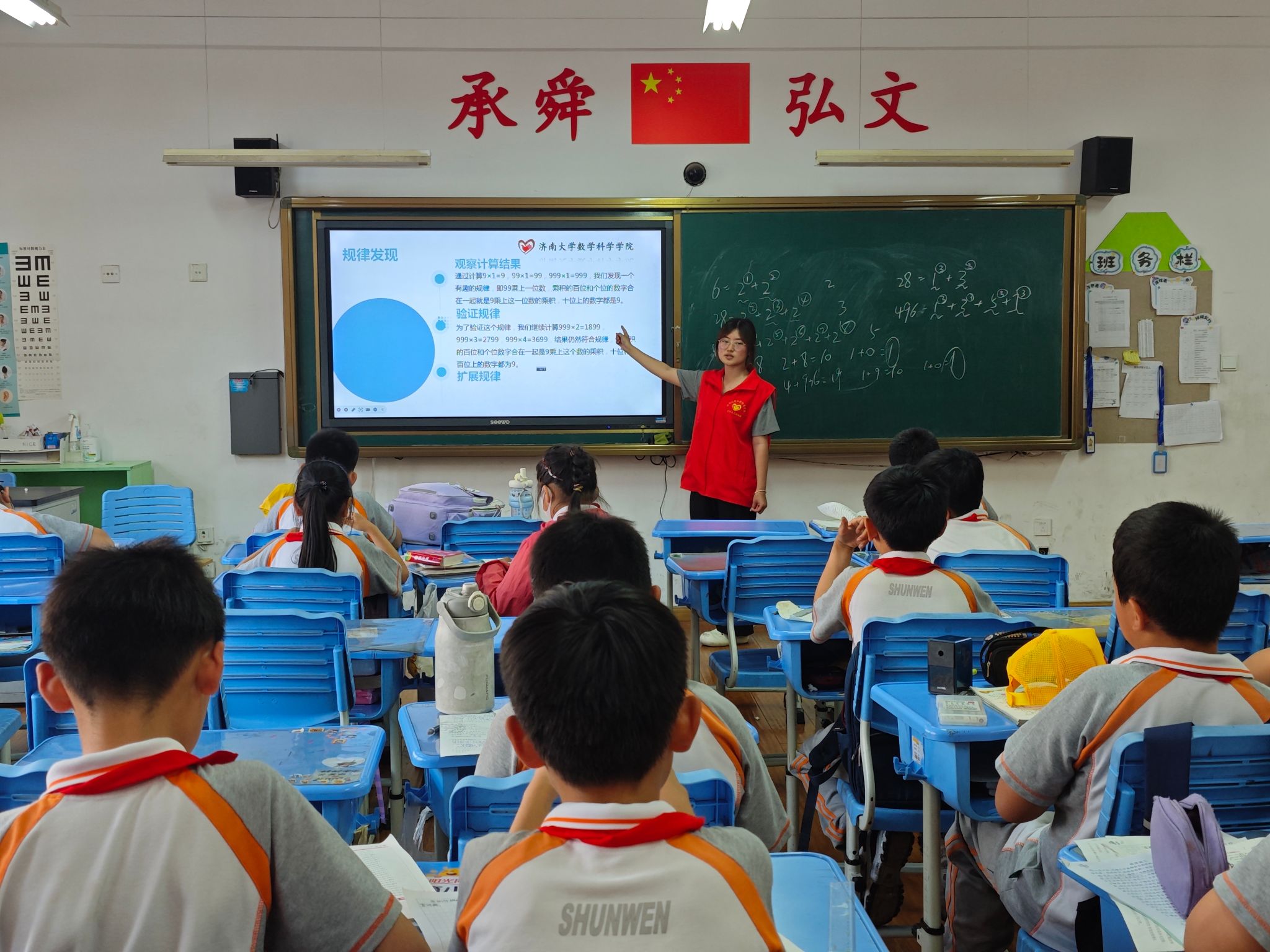 课程伊始,志愿者以生动有趣的视频引入“完美数”概念,将抽象的数学知识转化为通俗易懂的内容,让大家了解“完美数”的历史与应用。在九数相乘规律的教学环节中,志愿者采用互动式教学,通过列举实例、引导观察,逐步揭开隐藏在数字背后的奇妙规律,同学们也纷纷举手发言,分享自己的新发现。而在数长方形规律的教学中,志愿者借助精心准备的教具和图形,充分调动同学们的积极性,让大家通过动手操作、小组讨论,逐步总结归纳出规律,共同在轻松愉悦的氛围中学习数学知识。
