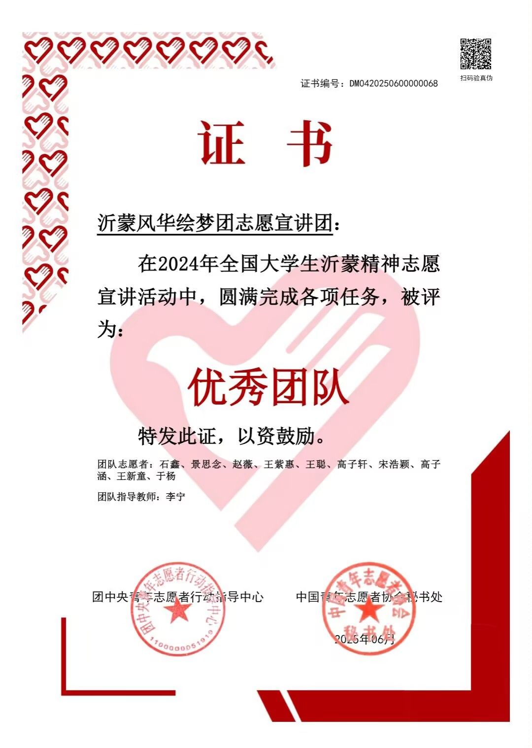 “沂蒙风华绘梦团”志愿宣讲团在1000支大学生志愿服务团队中脱颖而出,荣获“优秀团队”称号。