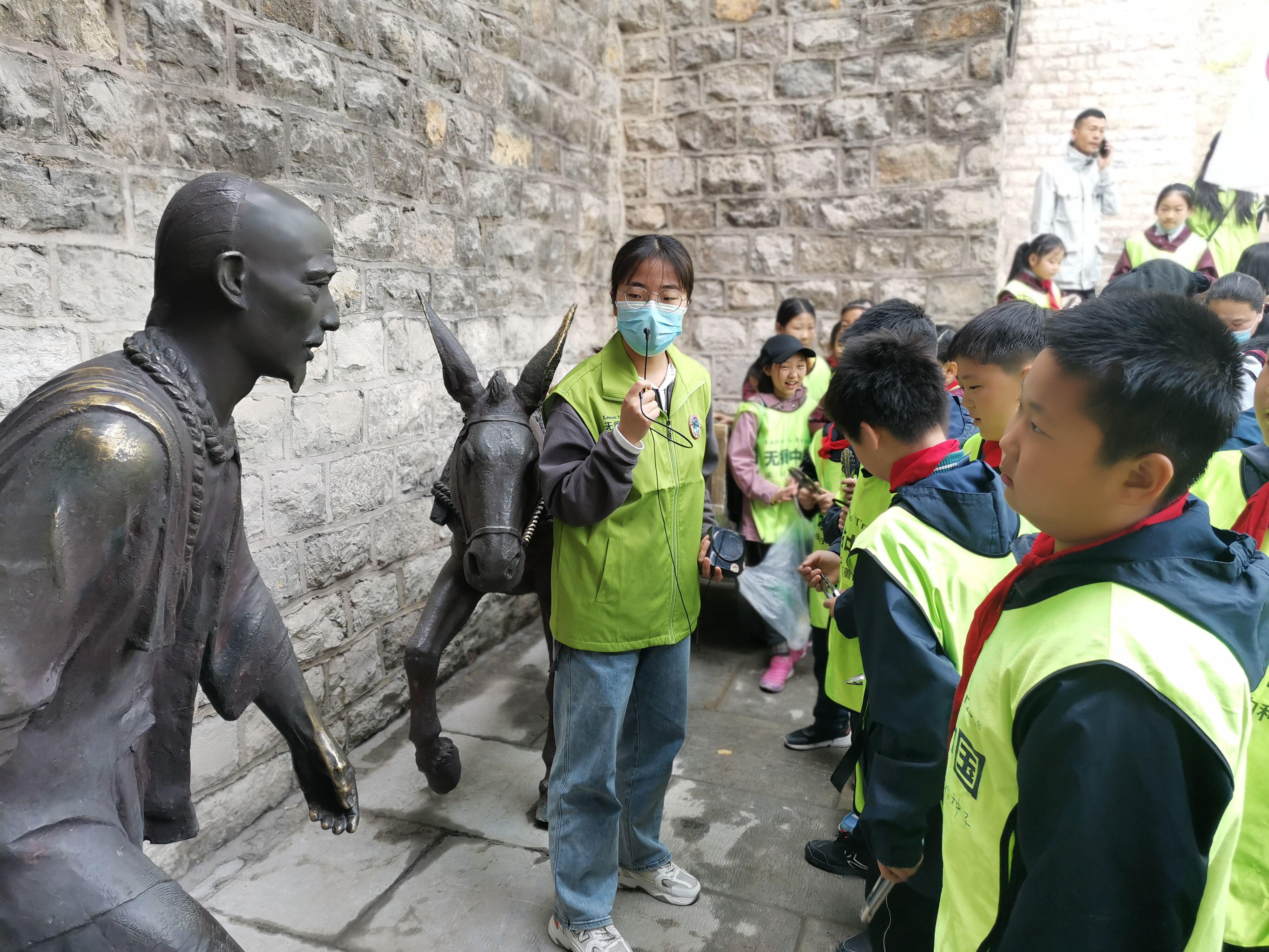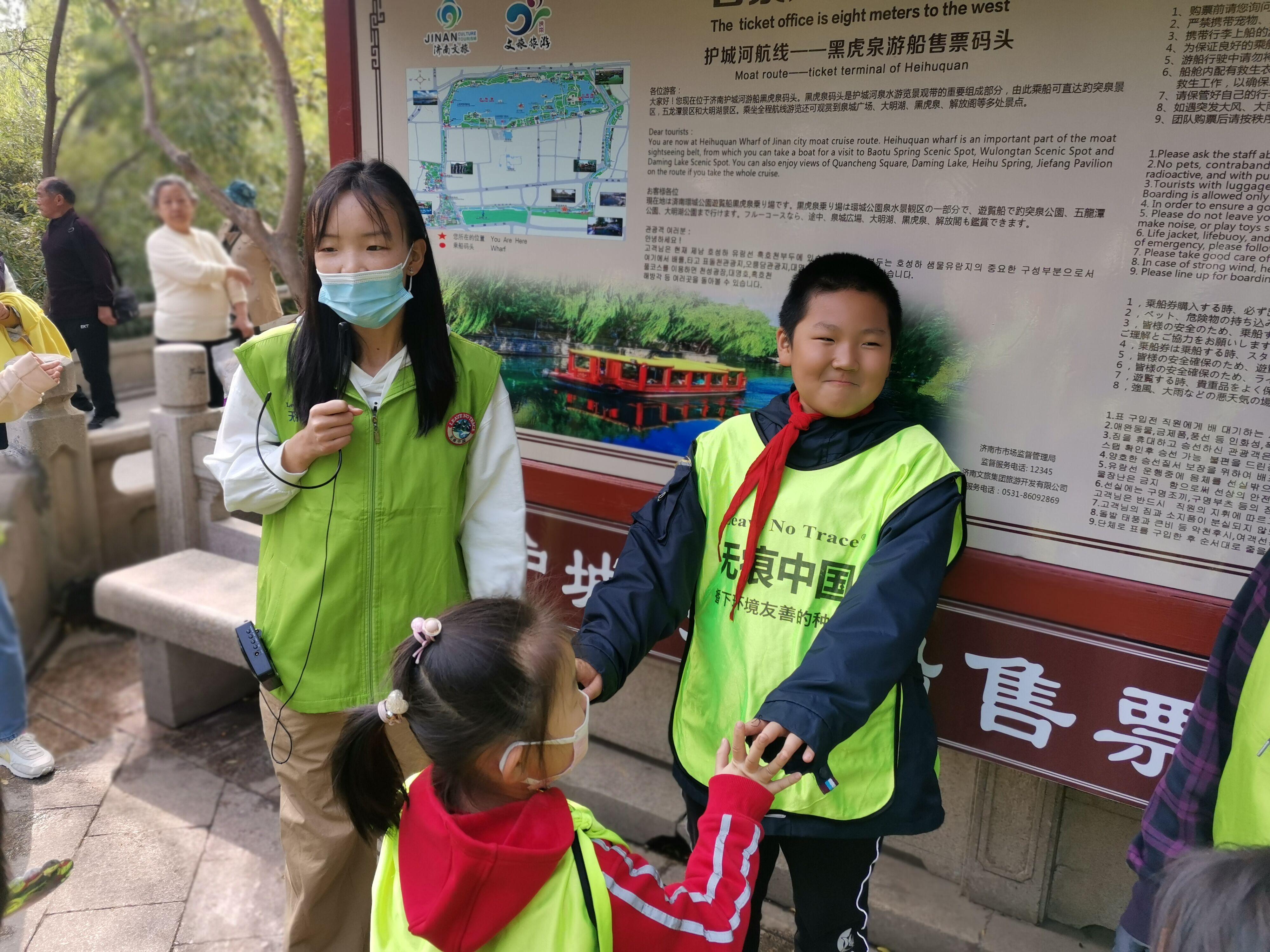 活动伊始,志愿者们为小朋友分发了带有“无痕中国”标识的马甲和专用的垃圾夹,教给他们约定集合的动作,向他们展示安全规则旗并宣讲。通过讲解,小朋友们了解到了“泉城”这个称号的由来和济南泉水形成的地理原因;了解到一百年前济南人是通过“隔窗取水”和“水夫毛驴”来取水用水的。最后,同学们带领小朋友参观了一个顶部为正方形有开口的亭子,介绍了它的四大特点。志愿者们生动细致的讲解让小朋友们对黑虎泉有了更加深入的了解。在游览过程的同时,小朋友们不忘爱护环境的宗旨,用垃圾夹捡道路上的垃圾。