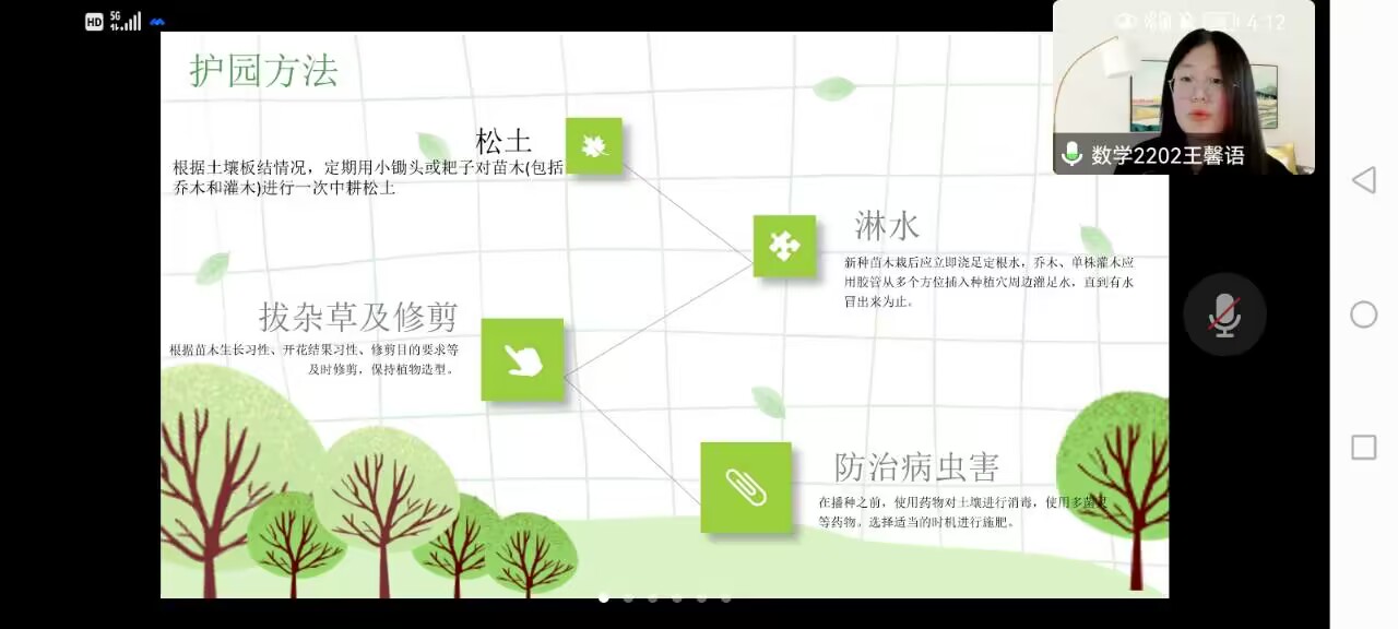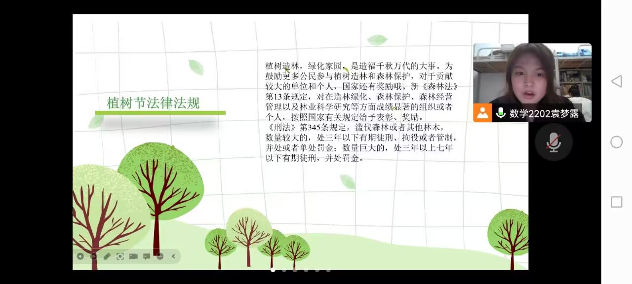 因天气原因,此次活动主要以线上的形式进行,由青年志愿者协会的袁梦露和王馨语两位同学带领大家学习相关内容。活动伊始,主持人先为同学们介绍了植树节的由来,三月十二日正好是植树护林的最佳时节,也是为了纪念孙中山先生一生倡导植树造林的功绩。借由此,主持人又向同学们展示了有关植树节的法律法规,同学们了解到该项法律不仅能鼓励更多公民参与植树造林和森林保护活动,而且也对破坏绿色家园的人起到惩罚的作用,体现出了国家现阶段对植树造林的重视。同时,主持人向同学们列举出了其他国家对于植树爱树的一些措施,也让同学们看到全世界都在为植树造林做出贡献。活动接近尾声,主持人为同学们介绍了植树护园的具体措施,护园看似是一项轻松的工作,实际上完成起来复杂而又困难,必须要依照不同的情况做出不同的处理措施。在了解到这些以后,同学们都表示要更广泛的参与到植树护园的队列中去。