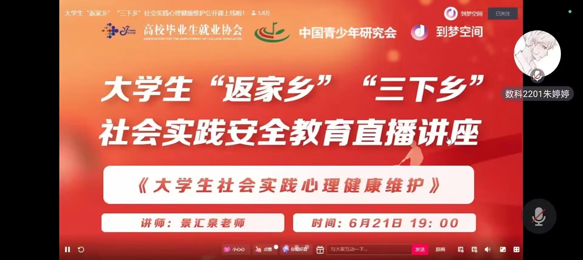 积极组织各实践队的同学们观看由学校团委联合到梦空间承办的2023年大学生“返家乡”、“三下乡”社会实践安全教育直播专题讲座,倡导同学们重视实践安全教育,推动实践教育的规范化、有序化、科学化开展。黑人av