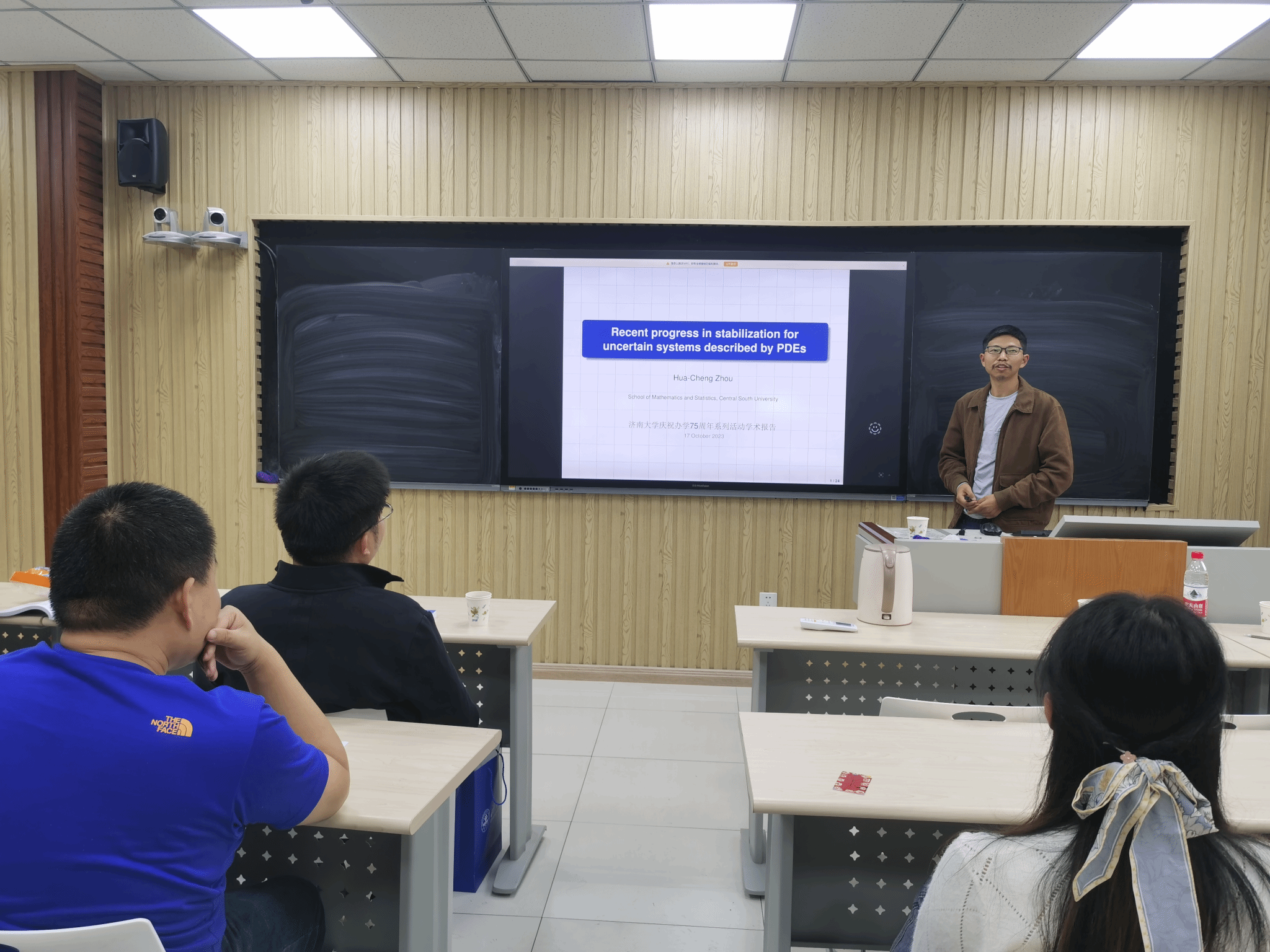 报告人简介:周华成,中南大学教授,博导,国家高层次青年人才。主要从事偏微分方程控制理论研究与抗扰控制研究。曾获中国科学院院长特别奖。在《IEEE Trans. Automat. Control》, 《Automatica》,《SIAMJ. Control Optim.》, 《ESAIM Control Optim. Calc. Var.》,《J.Differential Equations》,《中国科学:信息科学》等享有较高国际学术声誉的数学和控制领域主流刊物发表多篇论文。