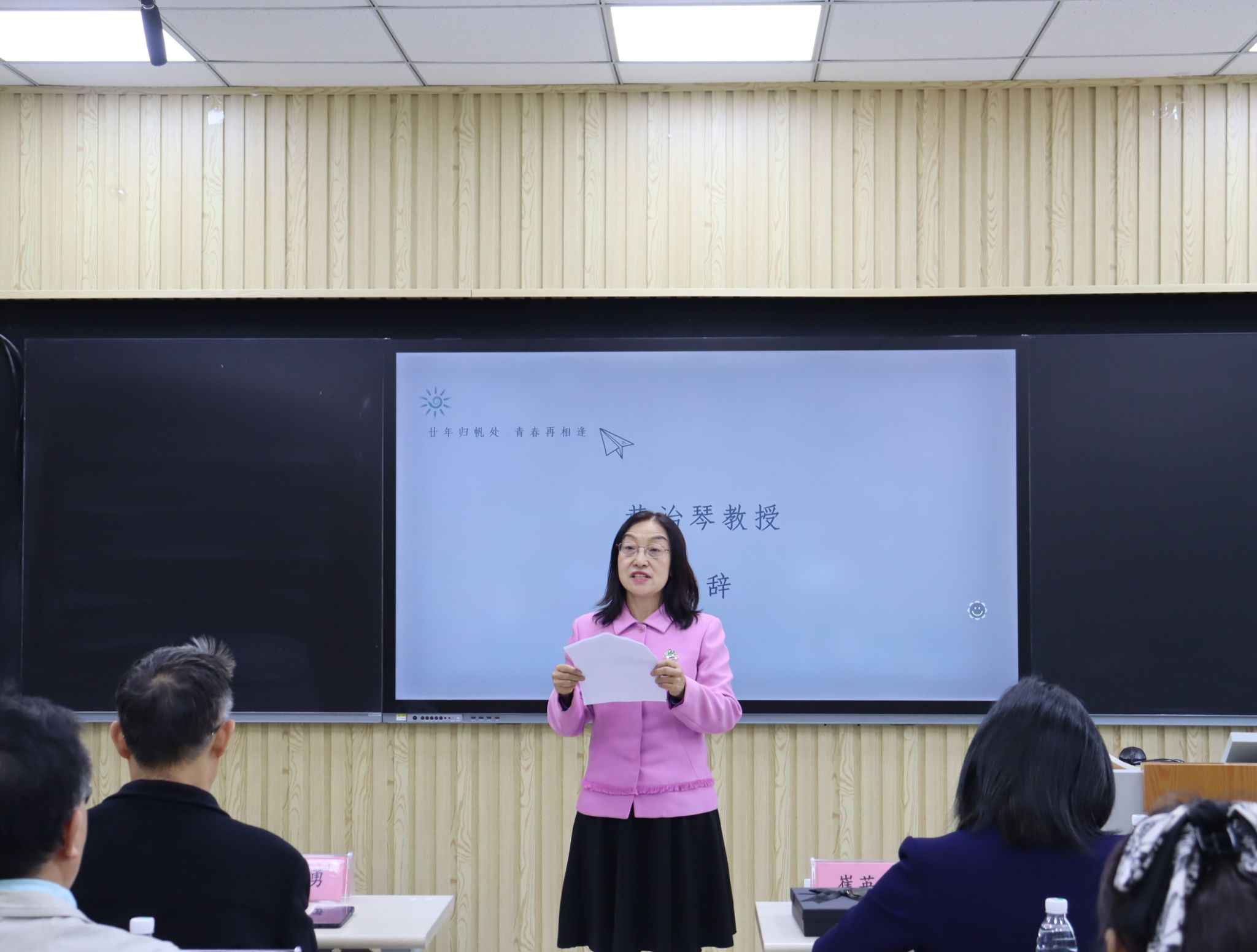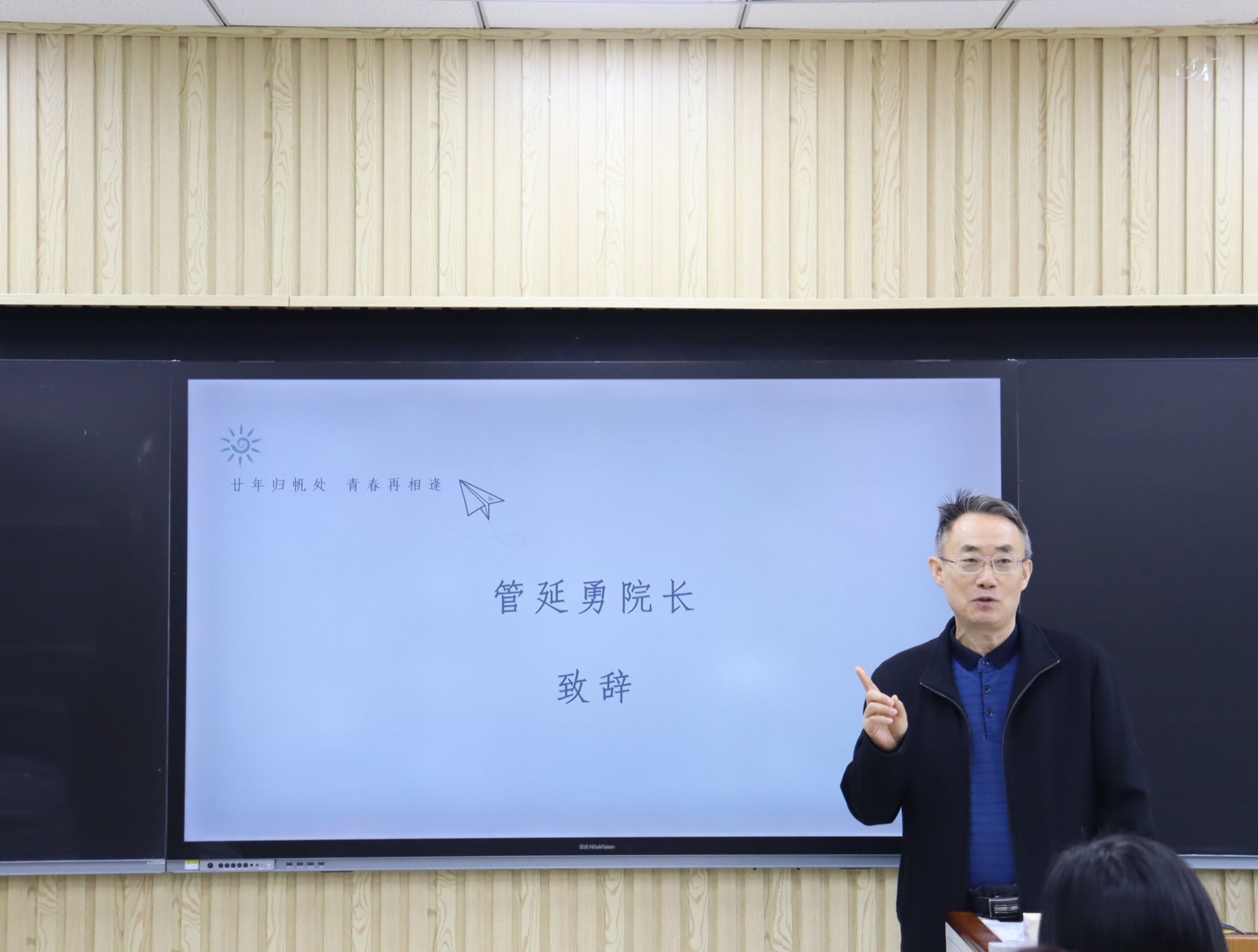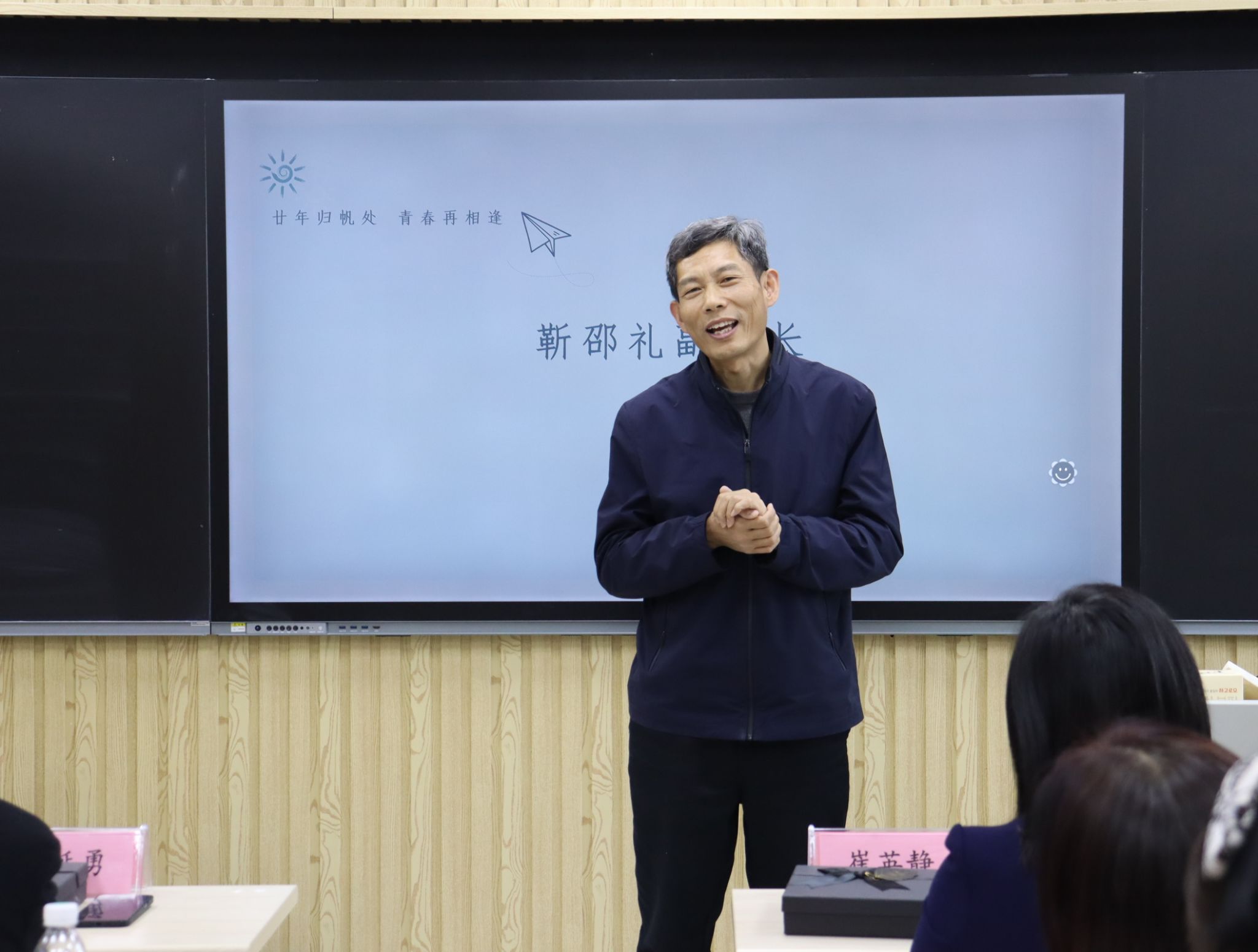 随后,在第七教学楼智慧教室举行了师生座谈会,学院领导、老师与校友们欢聚一堂,共叙旧情。学院党委书记崔英静代表学院对校友们返校表示热烈欢迎,介绍了学院近年来的发展建设情况,并感谢校友们长期以来对母校的关心和支持,真诚希望各界校友持续关注学院动态,助力学院高质量发展。与会领导、老师逐一为校友们送上衷心的祝福。校友们深情回顾师生间的深厚情谊和同窗间的难忘岁月,感恩老师们的辛勤教导和母校的精心培养。座谈会欢声笑语不断,热烈的掌声经久不息,处处涌动着浓浓的师生情谊和同窗之谊。