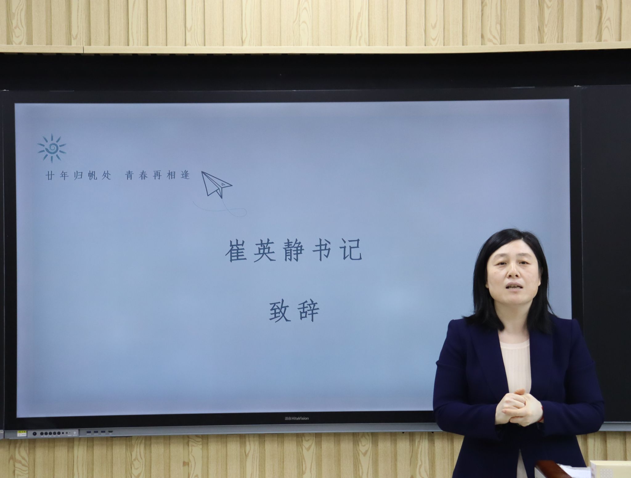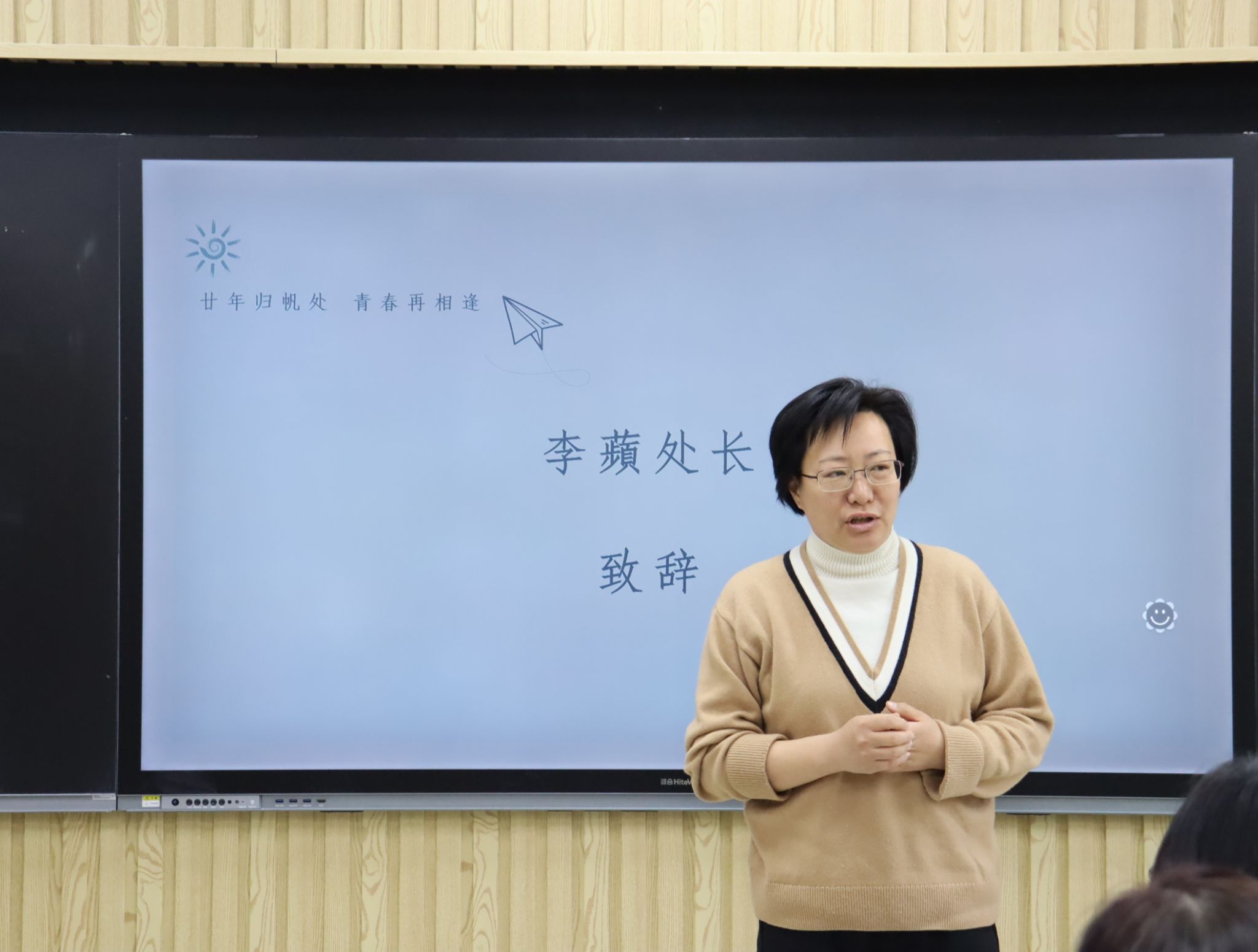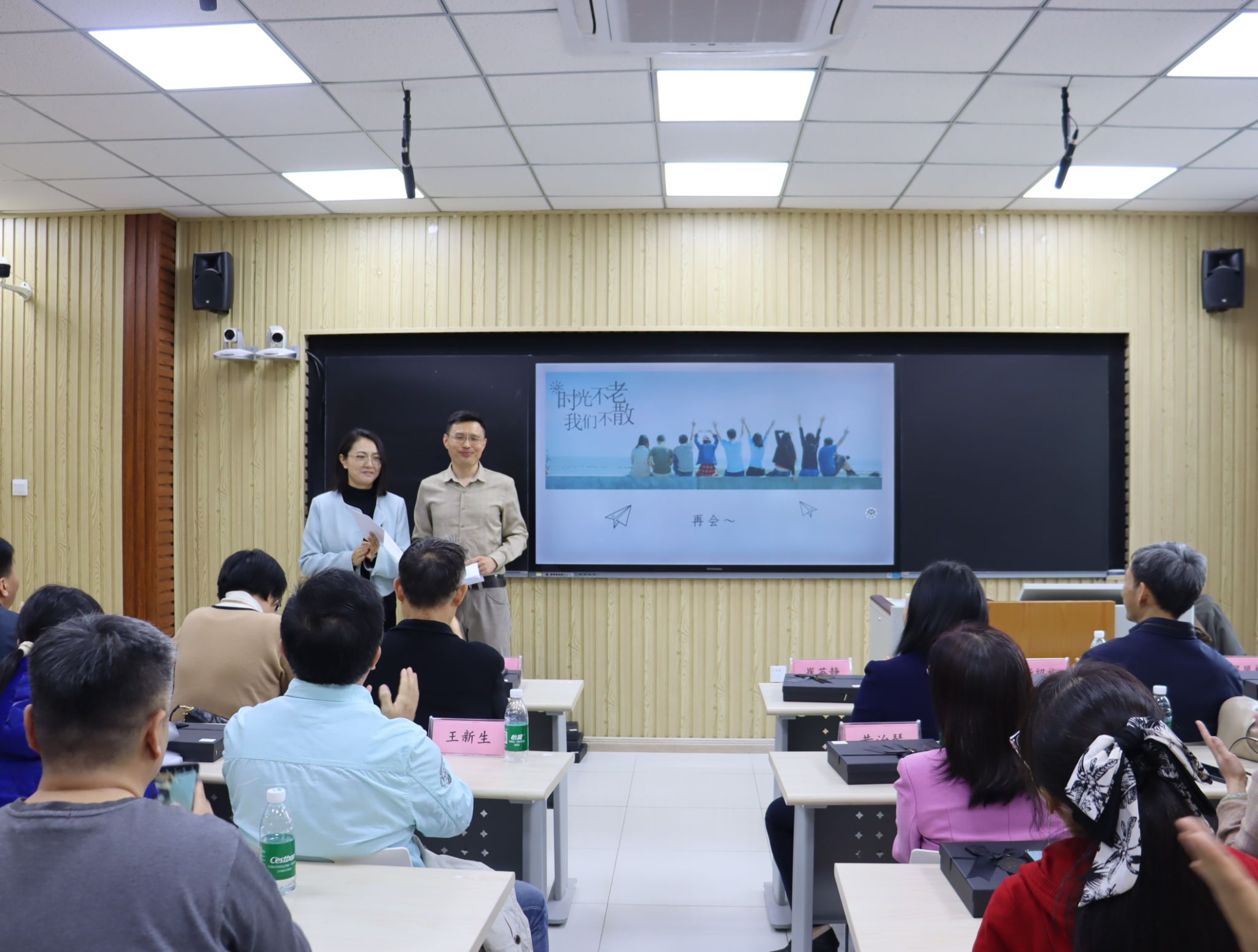 随后,在第七教学楼智慧教室举行了师生座谈会,学院领导、老师与校友们欢聚一堂,共叙旧情。学院党委书记崔英静代表学院对校友们返校表示热烈欢迎,介绍了学院近年来的发展建设情况,并感谢校友们长期以来对母校的关心和支持,真诚希望各界校友持续关注学院动态,助力学院高质量发展。与会领导、老师逐一为校友们送上衷心的祝福。校友们深情回顾师生间的深厚情谊和同窗间的难忘岁月,感恩老师们的辛勤教导和母校的精心培养。座谈会欢声笑语不断,热烈的掌声经久不息,处处涌动着浓浓的师生情谊和同窗之谊。