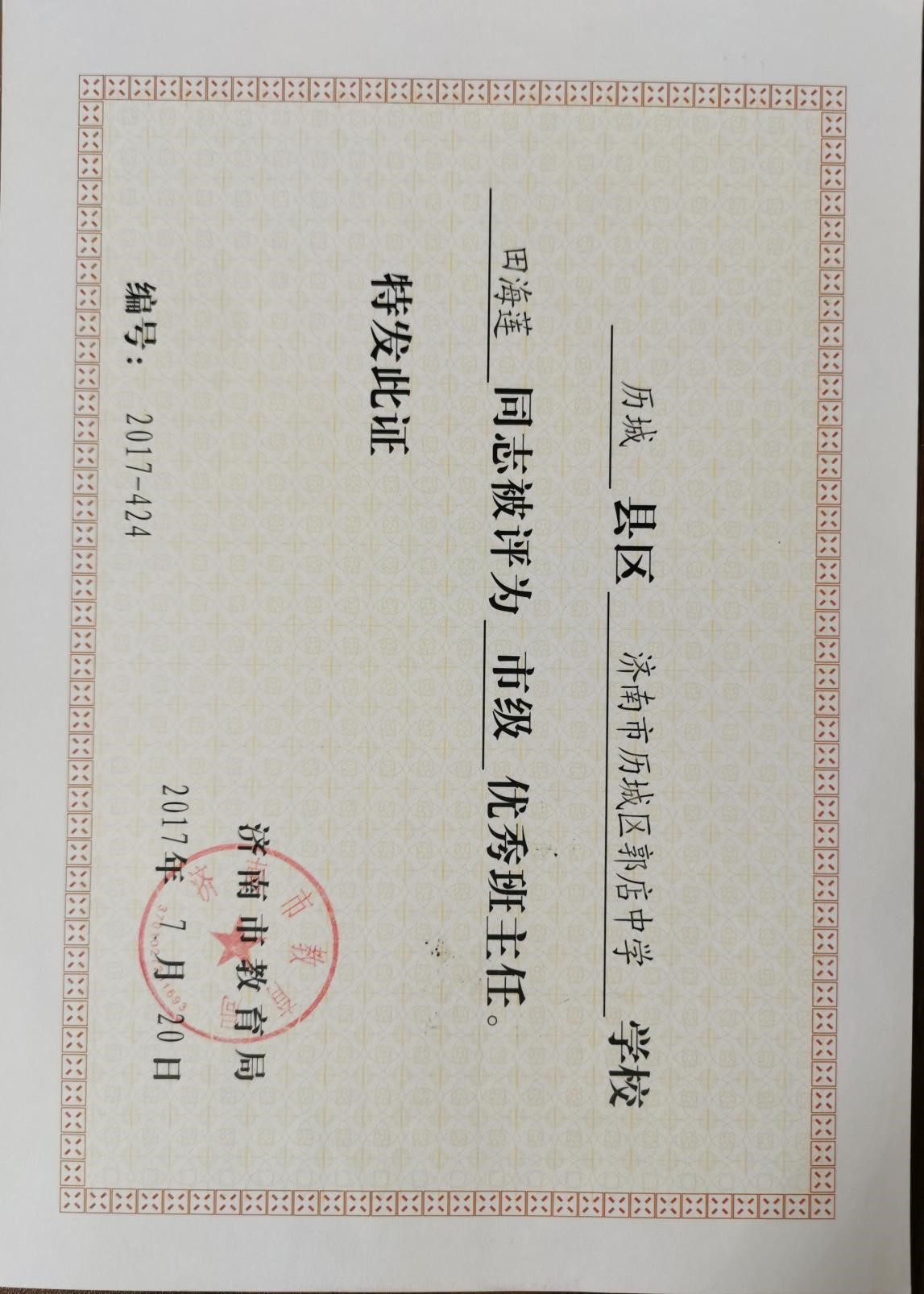每当我接手一个班集体,我都会告诉同学们我最看重的是人品,一撇一捺把人做好,才能在社会上立足。我们一定要弘扬社会主义核心价值观,做对社会有贡献的人。同学们都说我是真正让他们喜欢的老师。所带班级班风正,学生们都是满满的正能量。20135月所带班级被评为“济南市优秀班集体”。2014年我被评为“历城区政府优秀班主任”。2017年被评为“济南市优秀班主任”。